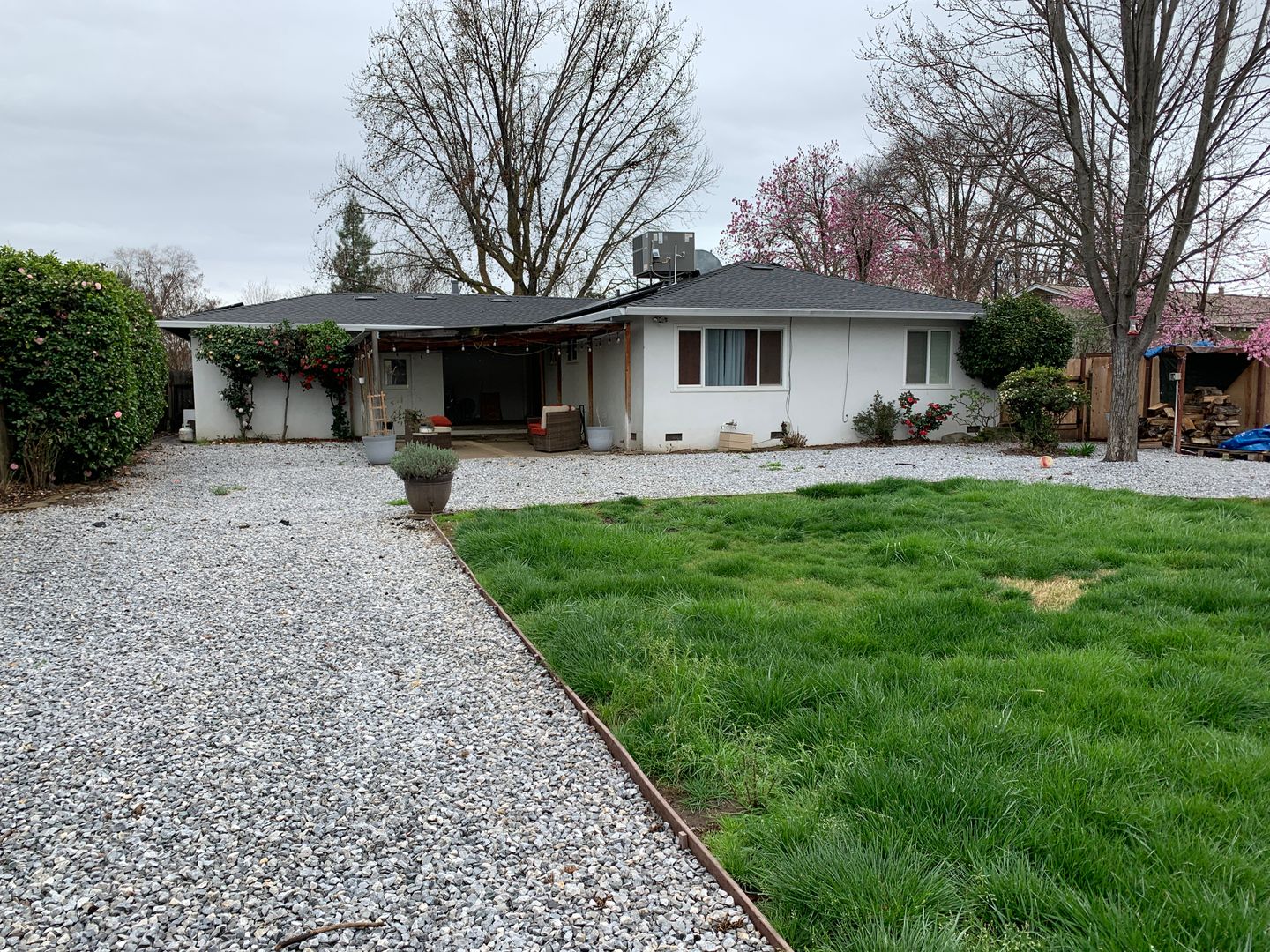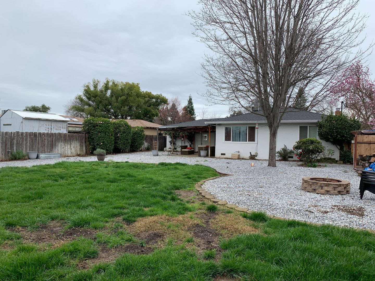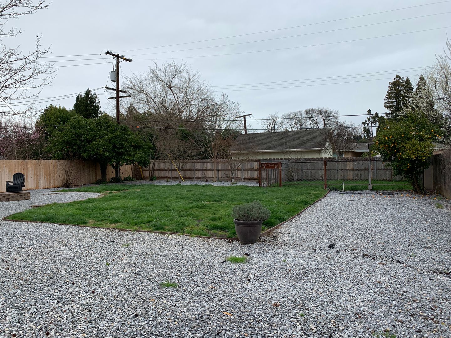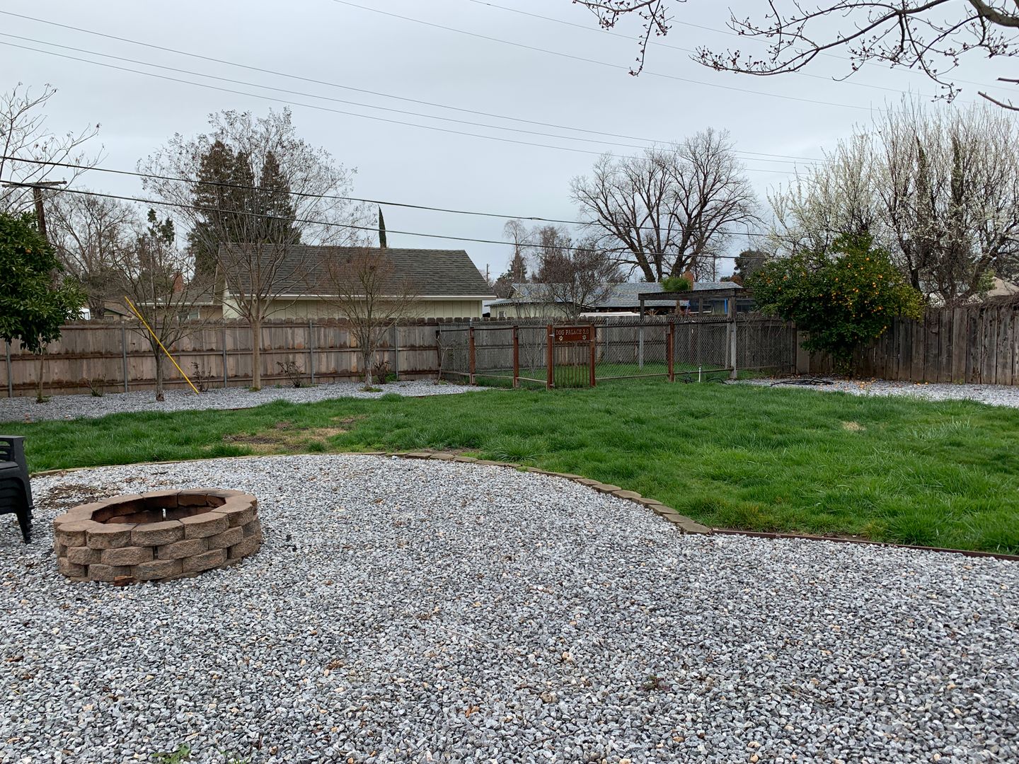 Huge backyard which would be perfect for entertaining and close to shops and schools. Backyard also features a fire pit, a dog run, outdoor seating, and orange/lemon trees.